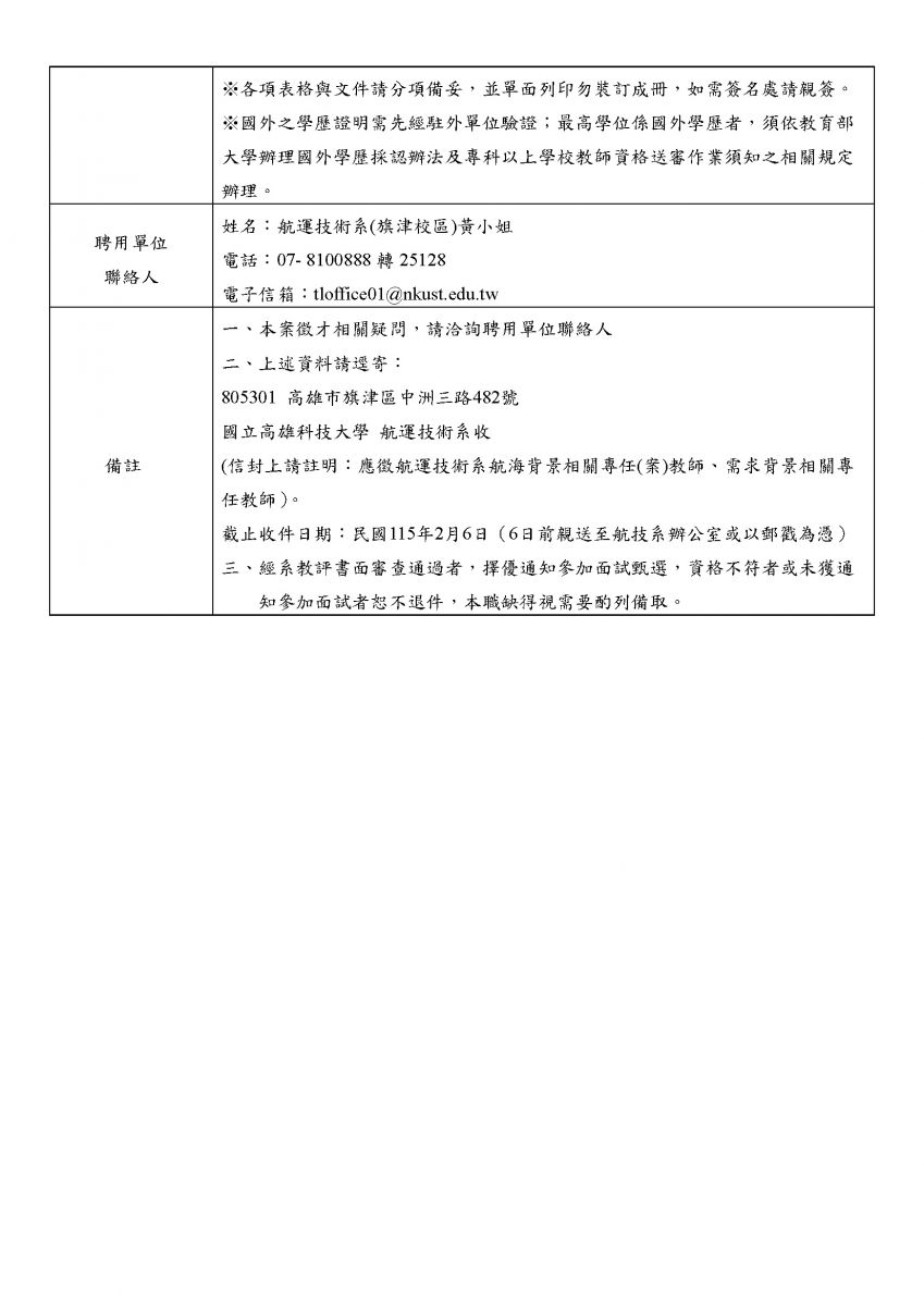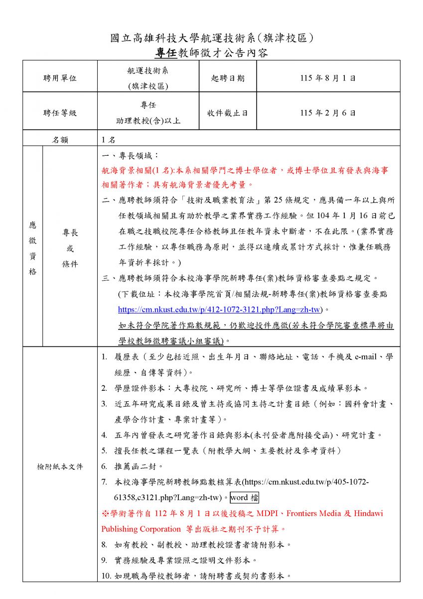 國立高雄科技大學航運技術系 徵聘公告 連結請點⮕助理教授以上專任教師-1名 收件至115年2月6日 ※本校海事學院新聘教師資格審查法規"連結"如下(內含核算表word檔): https://cm.nkust.edu.tw/p/405-1072-61358,c3121.php?Lang=zh-tw