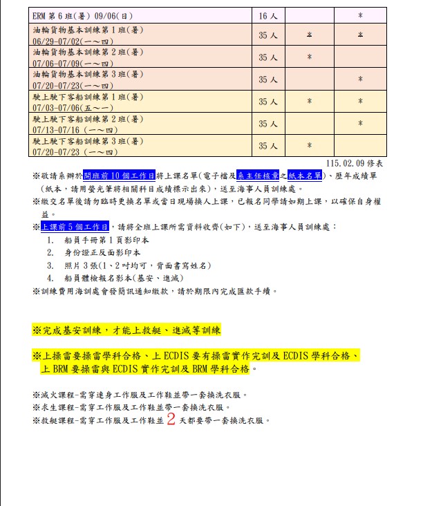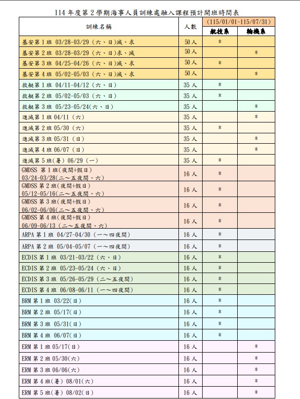 114學年度第2學期海事人員訓練處融入課程預計開班時間表