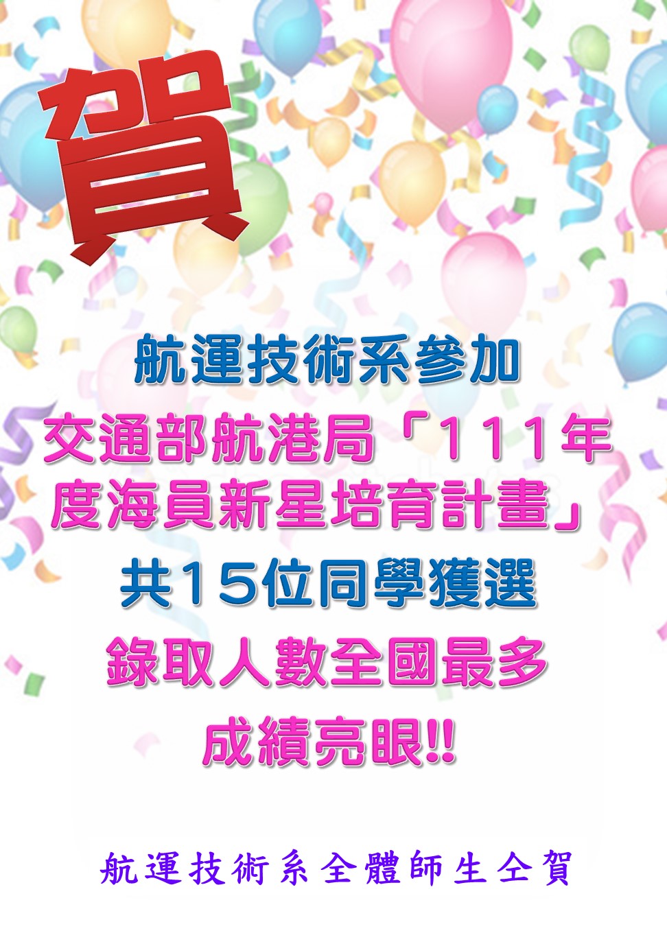賀!航運技術系參加交通部航港局「111年度海員新星培育計畫」,錄取人數全國第一,成績亮眼!