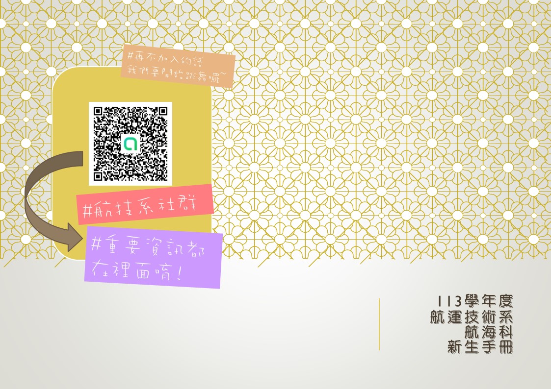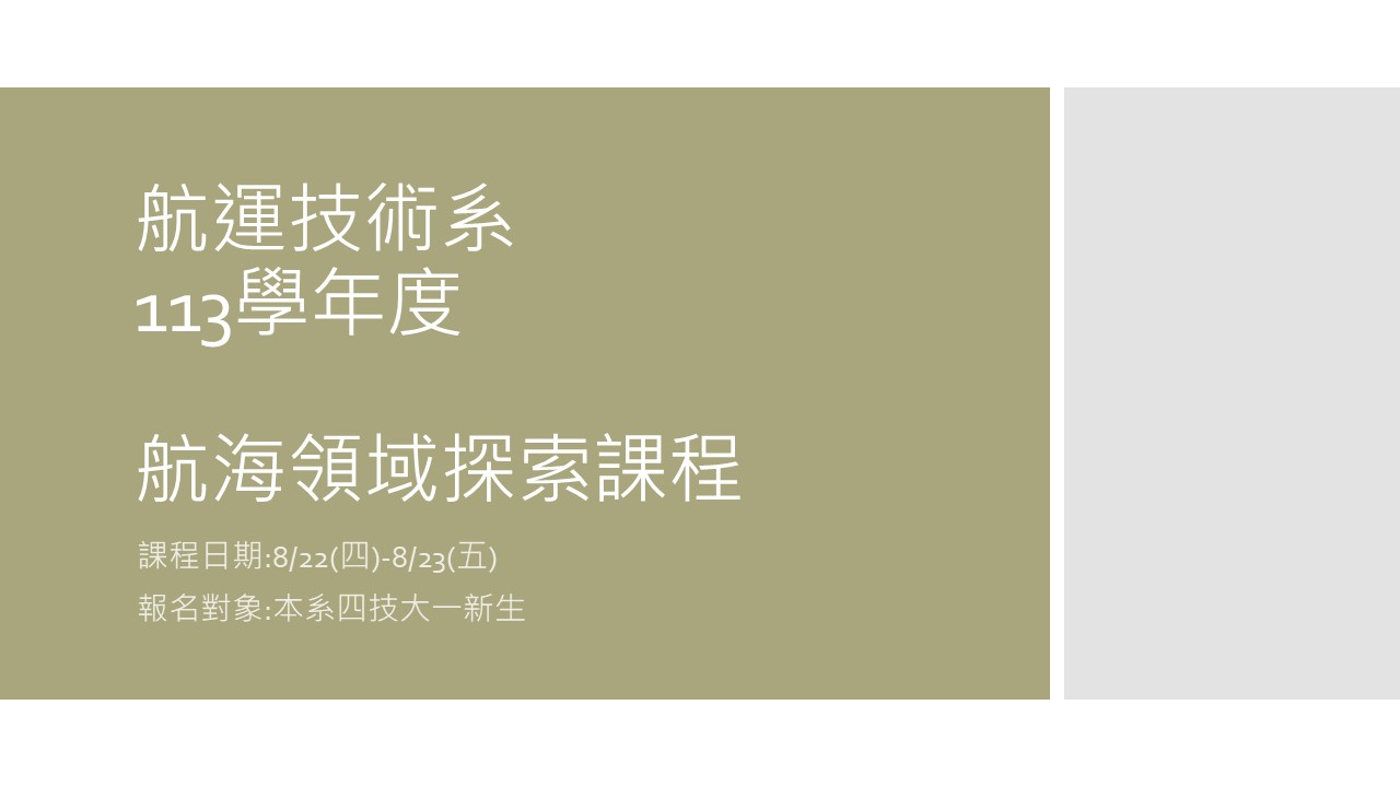 課程名稱:航海領域探索課程 報名對象:本系四技大一新生 課程日期:8/22(四)-8/23(五) 報名日..